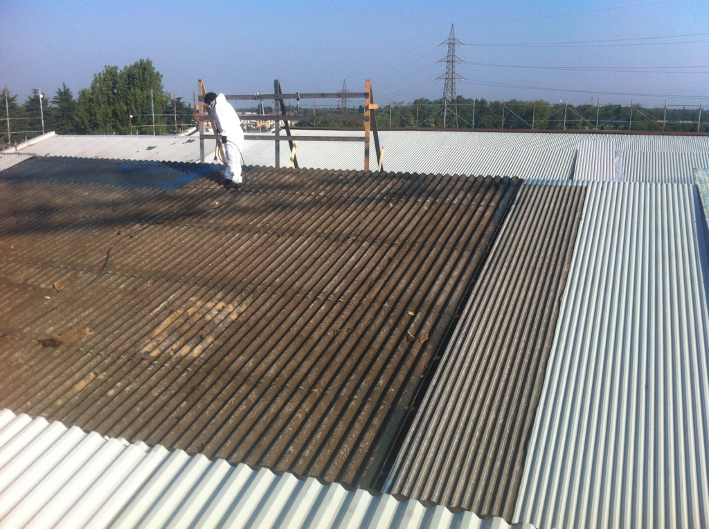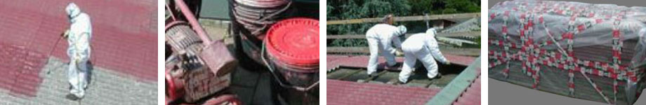 Le lastre in cemento – amianto vengono “bagnate e verniciate” con collanti e vernici specifiche per mezzo di pompe a bassa pressione per evitare le dispersioni eoliche delle fibre di amianto. - Rimozione delle Lastre