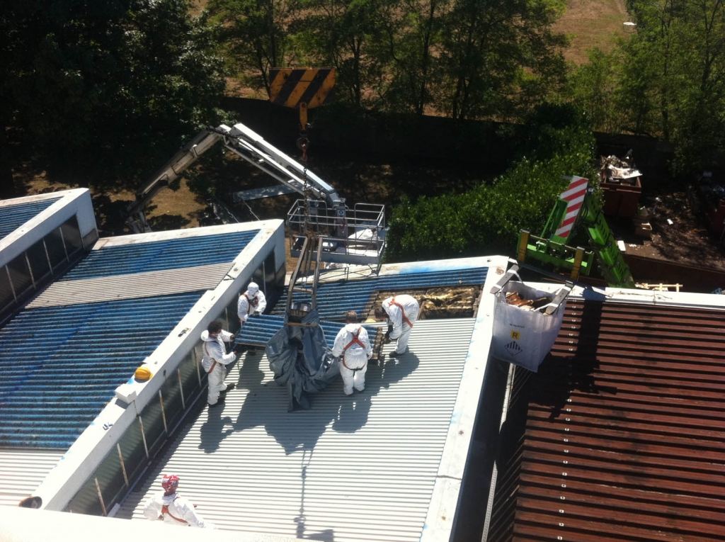 La rimozione delle lastre viene effettuata in modo tale da lasciare le lastre integre. I materiali asportati vengono quindi calati a terra tramite mezzi di sollevamento e scarico idonei. - Imballaggio dei Rifiuti