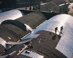 La Mariuzzo Luigi consente di realizzare qualsiasi tipo di copertura su qualsiasi forma di tetto. Realizzazione di sovra copertura con lastre curve in alluminio naturale su cemento – amianto, previo trattamento a base di vernici speciali che evitino la dispersione delle fibre.